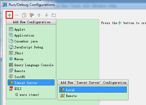 2.点击 "+" -> Tomcat Server -> Local,创建一个新的Tomcat容器