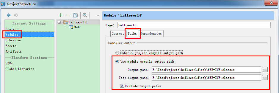 6.点击Modules -> Paths,勾选"Use module compile output path",将"Output path"和"Test Output path"都改为之前创建的classes目录
