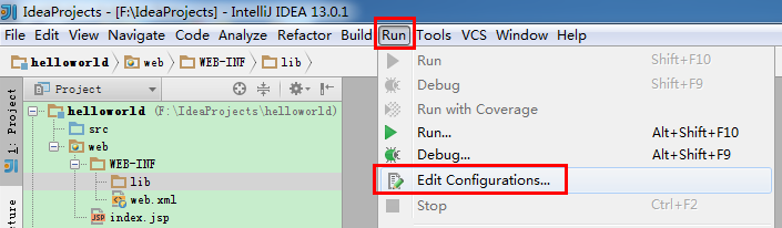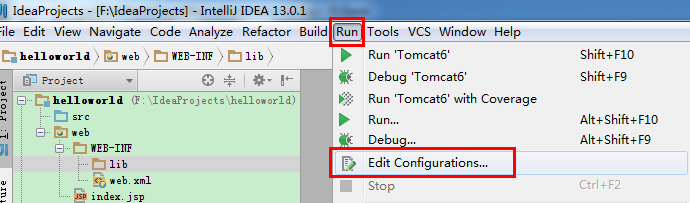1.Run -> Edit Configurations,进入"Run Configurations"窗口