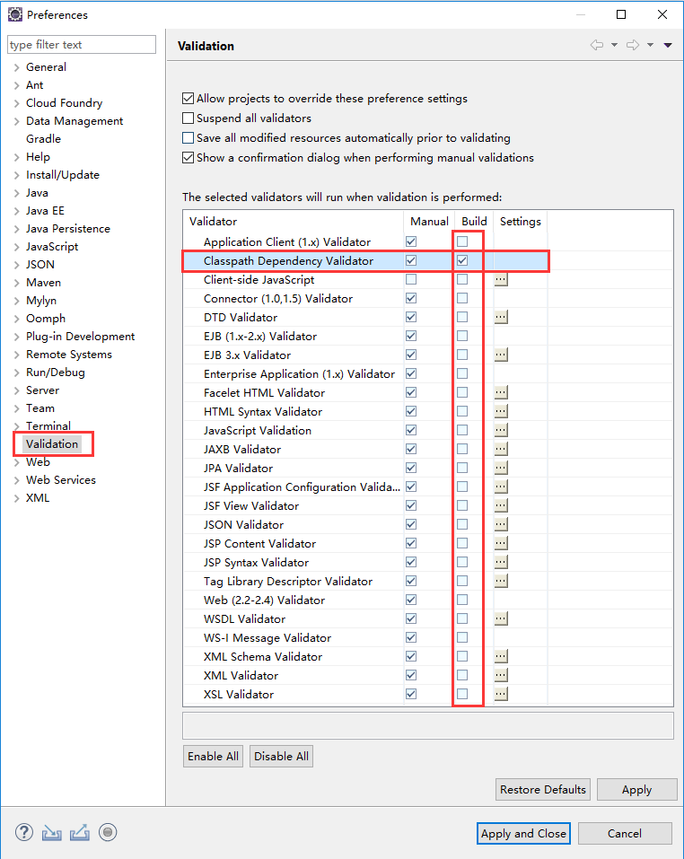 打开eclipse选中菜单:Window->preferences->Validation