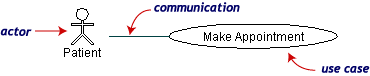 一个用例图是角色,用例,和它们之间的联系的集合。我们已经把Make Appointment作为一个含有四个角色和四个用例的图的一部分。注意一个单独的用例可以有多个角色。