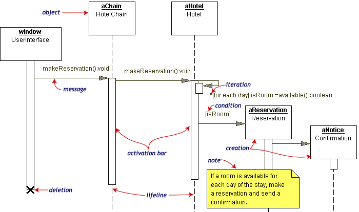 顺序图将交互关系表示为一个二维图。纵向是时间轴,时间沿竖线向下延伸。横向轴代表了在协作中各独立对象的类元角色。类元角色用生命线表示。当对象存在时,角色用一条虚线表示,当对象的过程处于激活状态时,生命线是一个双道线。