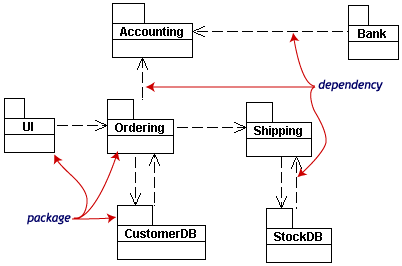 包是用一个在上方带有小标签的矩形表示的。包名写在标签上或者在矩形里面。点化线箭头表示依赖