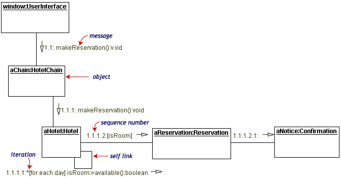 协作图的每个消息都有一个序列号。顶层消息的数字是1。同一个等级的消息(也就是同一个调用中的消息)有同样的数字前缀,再根据他们出现的顺序增加一个后缀1,2等等。