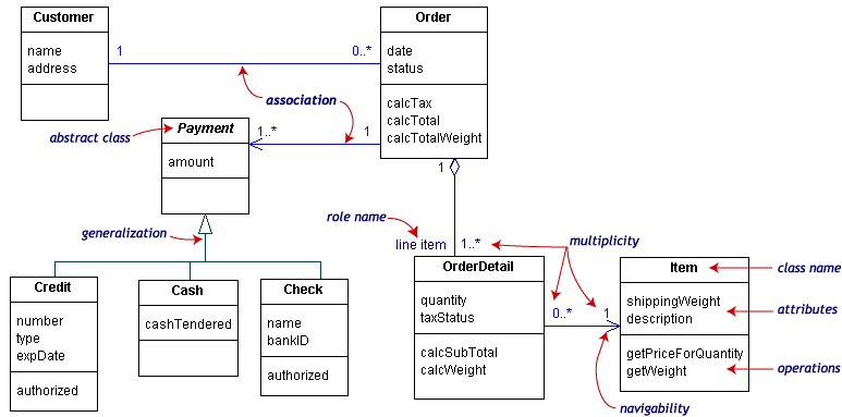 下面是一个顾客从零售商处预定商品的模型的类图。中心的类是Order。连接它的是购买货物的Customer和Payment。Payment有三种形 式:Cash,Check,或者Credit。订单包括OrderDetails(line item),每个这种类都连着Item。