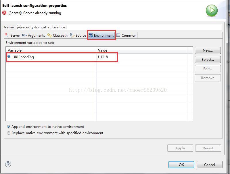 2、点击Open launch configuration,在Environment下添加URIEncoding,然后点击apply,重启eclipse即可