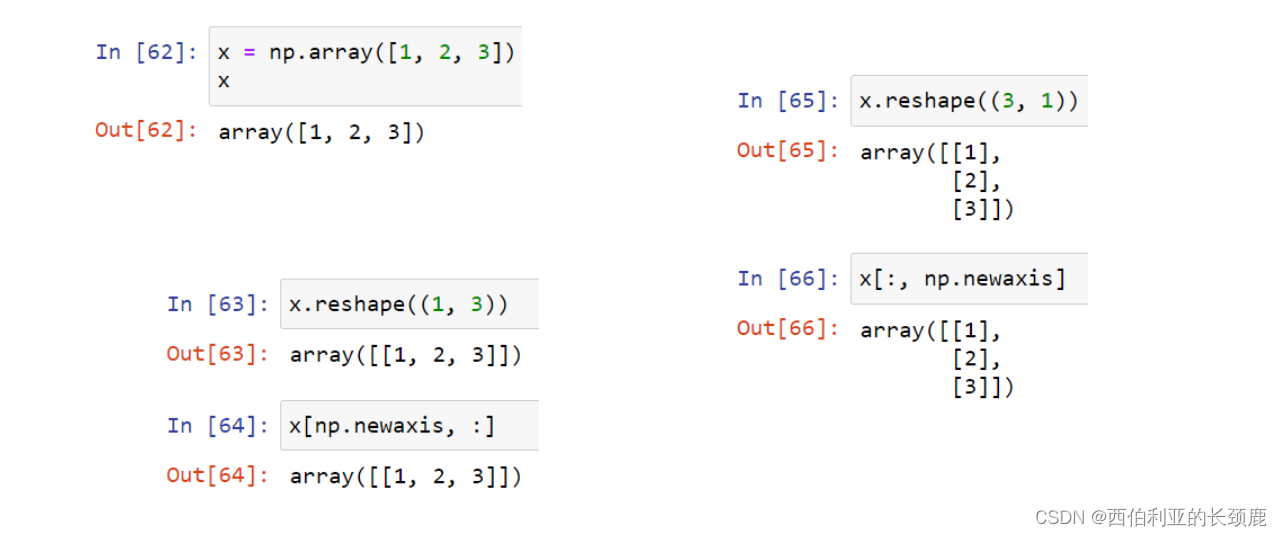 将一维数组转换为二维行或列矩阵可以使用重塑()方法完成,也可以在切片操作中使用关键字newaaxis。