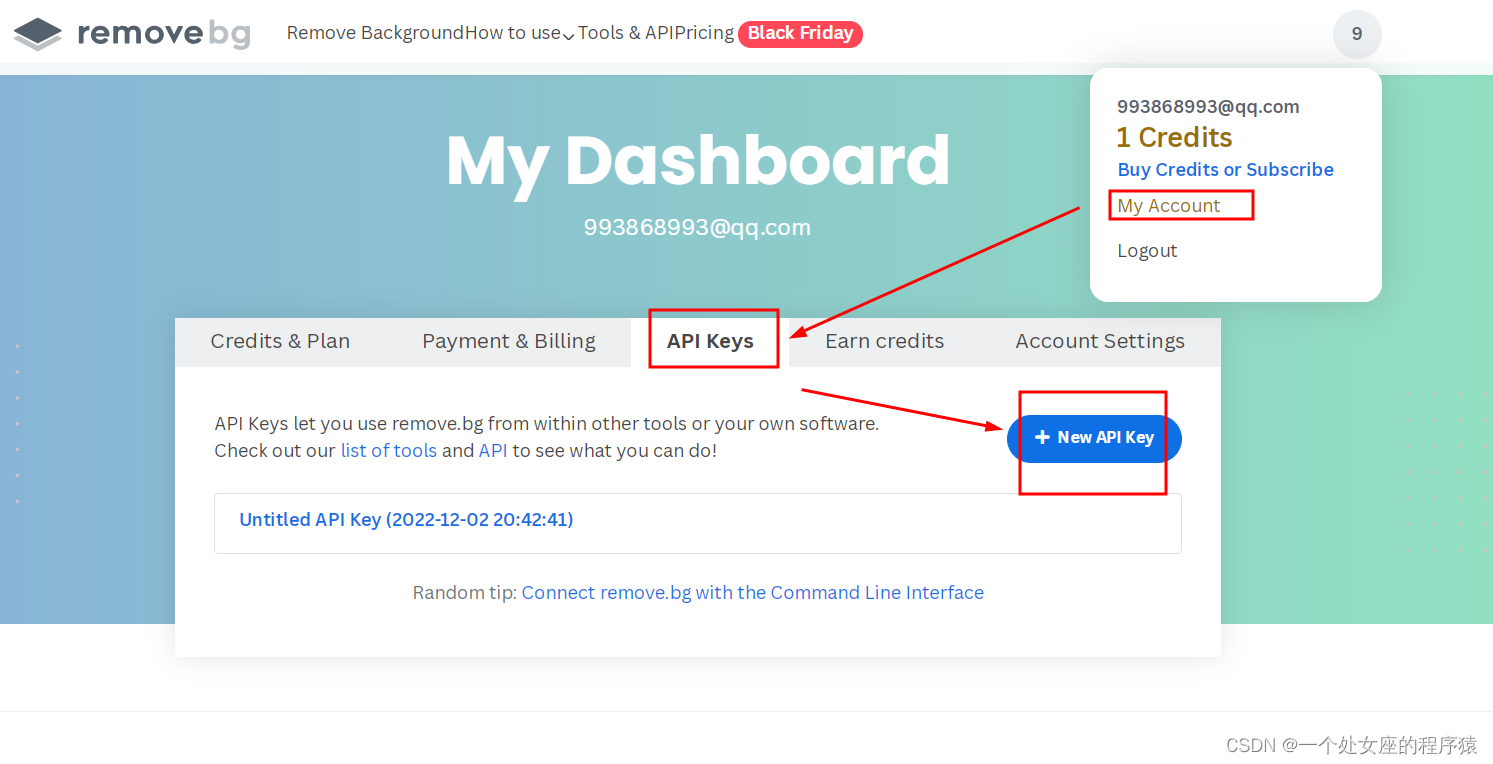 首先我们要去removebg注册一个账号,注册好之后,我们获取一个APIKey
