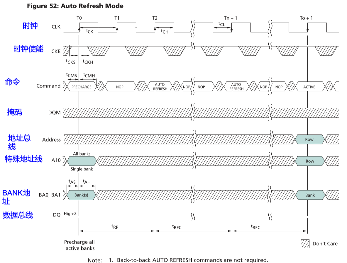 - 自刷新模式则主要用于休眠模式低功耗状态下的数据保存,自刷新过程无需外部时钟参与,与自动刷新相同的是,刷新行地址由内部刷新计算器控制,无需外部写入。
