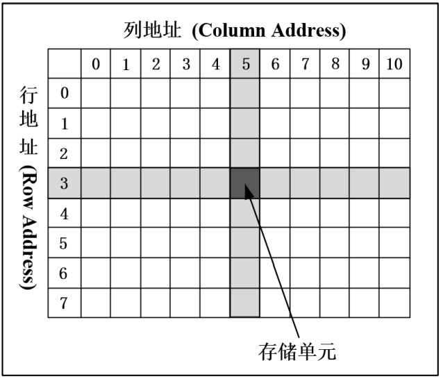 简单来说,SDRAM 内部可以理解为一个存储阵列,这是 SDRAM 区别于管道式存储,实现随机地址存取的结构特点。表格中的每一个单元格可以类比为存储阵列的单个存储单元。若想要实现存储阵列中的某一存储单元的数据读写操作,我们要通过行地址(Row Address)和列地址 (Column Address)(先行后列)精确定位到这一存储单元,进而进行数据的读写操作,这就是所谓的随机地址存取。