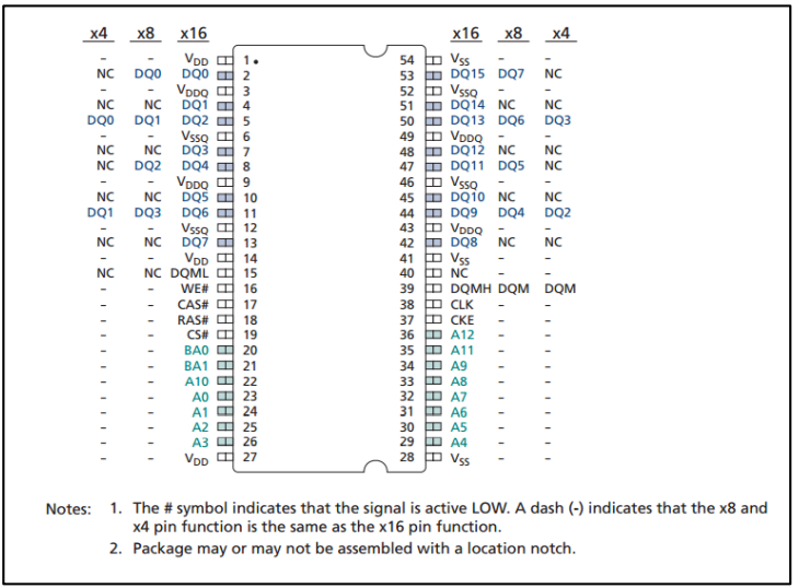 x4、x8、x16 分别表示位宽 4bit、8bit、16bit;#符号表示信号为低电平有效;短 划线 - 表示 x8 和 x4 引脚功能与 x16 引脚功能相同。