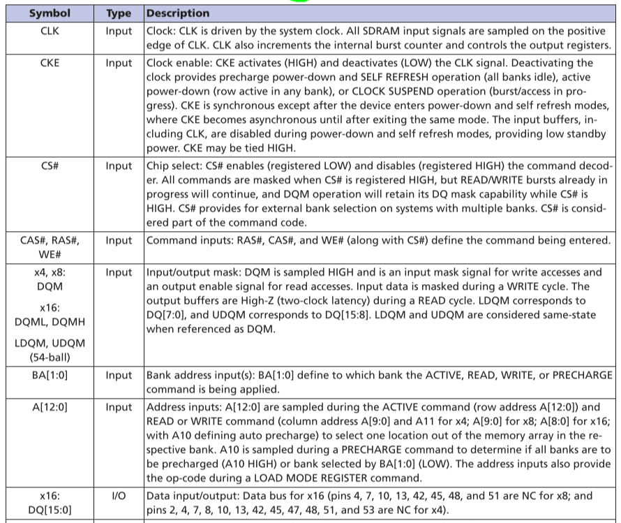 SDRAM 引脚功能描述如下: