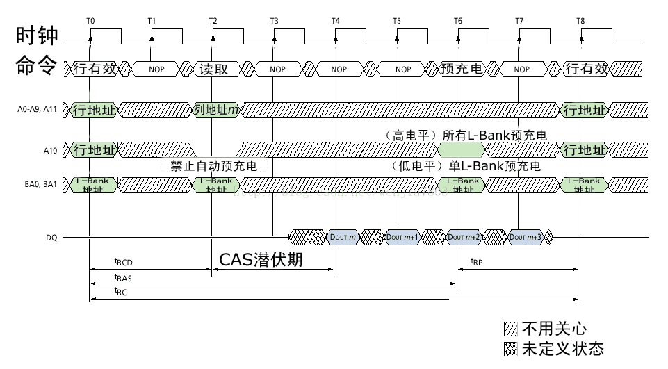 预充电的作用就是关闭指定的Bank 或者全部Bank 中激活的行,预充电命令执行 后,必须等待对应的等待时间 tRP(tRP(Precharge command Period),预充电命令周期),相对应的 Bank 将可以被重新操作。