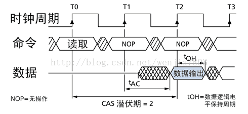相关的列地址被选中之后,将会触发数据传输,但从存储单元中输出到真正出现在内存芯片的 I/O 接口之间还需要一定的时间,时间就是 CL(CAS Latency,选通潜伏期)。CL 的数值与 tRCD 一样,以时钟周期数表示。下图CL为2个时钟周期。