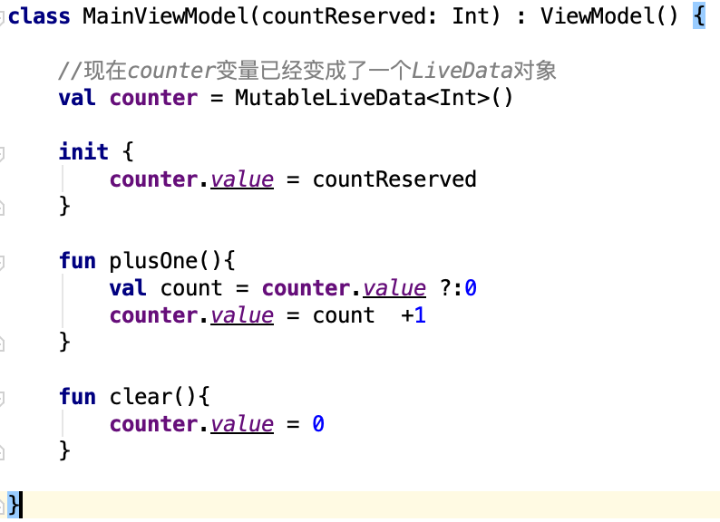 可以看到, 这里在init {} 给counter设置数据, 这样之前保存的计数值就可以在初始化的时候得到恢复。