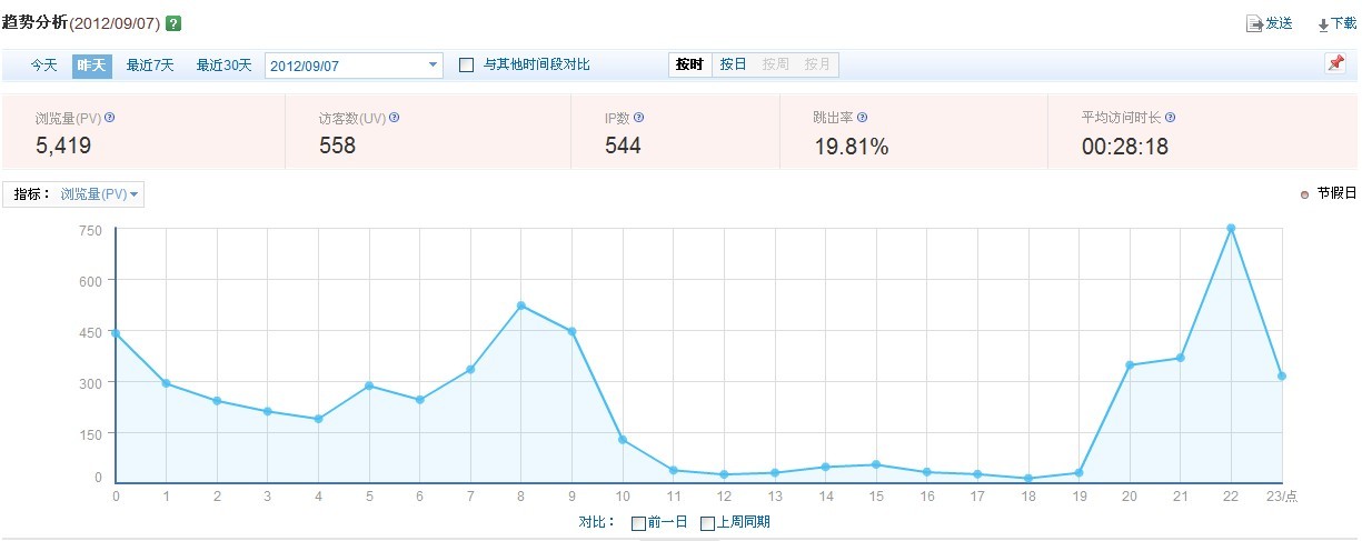 笔者网站主题是凤凰古城住宿,客栈酒店类别,这类网站PV一般为IP3倍左右就算的上是一个好网站了。但是大家可以看见,昨日网站IP数量为544,PV5419,是IP的10倍左右。平均IP停留时长28分。看了这些是否会觉得惊奇?只要做好细节,普通网站也可以达到这样的程度。