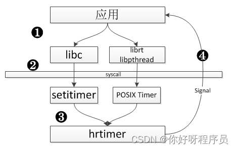 ❶应用调用库通过系统调用创建Timer,同时自身注册信号处理函数。
