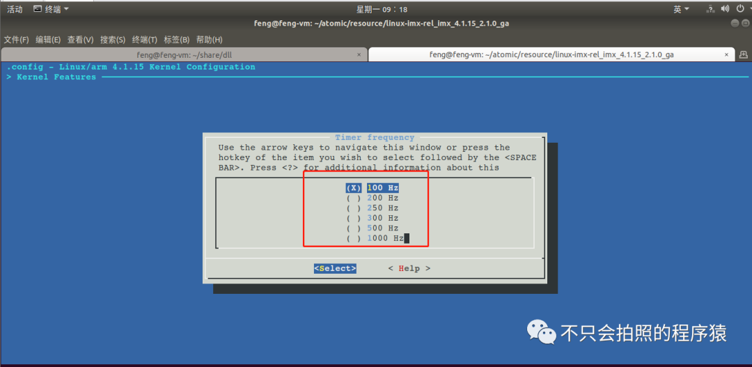 1. 系统时钟频率的配置方法,在linux内核目录中,运行make menuconfig,使用图形界面,选择Kernel Features -> Timer frequency (<choice> [=y])设置。