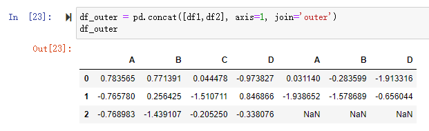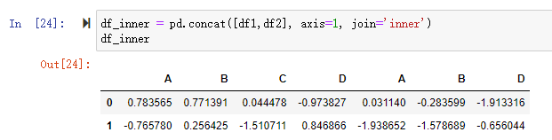 横向关联拼接(只保留左右都存在的索引行,df2没有第3行,存在NaN)