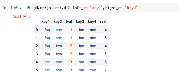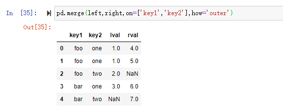 多键连接时将连接键组成列表传入,例:pd.merge(df1,df2,on=['key1','key2']