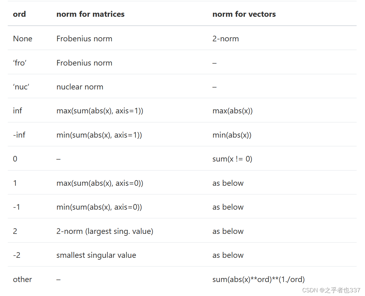 在矩阵范数的计算中,最重要的是ord参数,可选值如下: