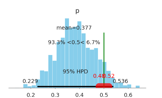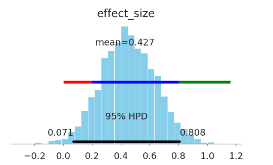 - 95% highest posterior density (HPD, 大概类似于置信区间) 包含了 region of practical equivalence (ROPE, 实际等同区间).
