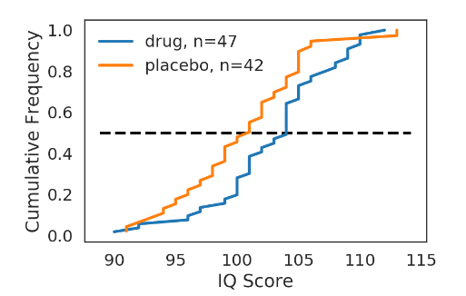 注: IQ的差异在10以上才有点意义. p-value=0.02说明组间有差异, 但没说差异有多大..