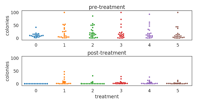 - 菌落计数符合泊松分布: dataij∼Poisson(μij),j∈[pre,post],i∈[1,2,3...]