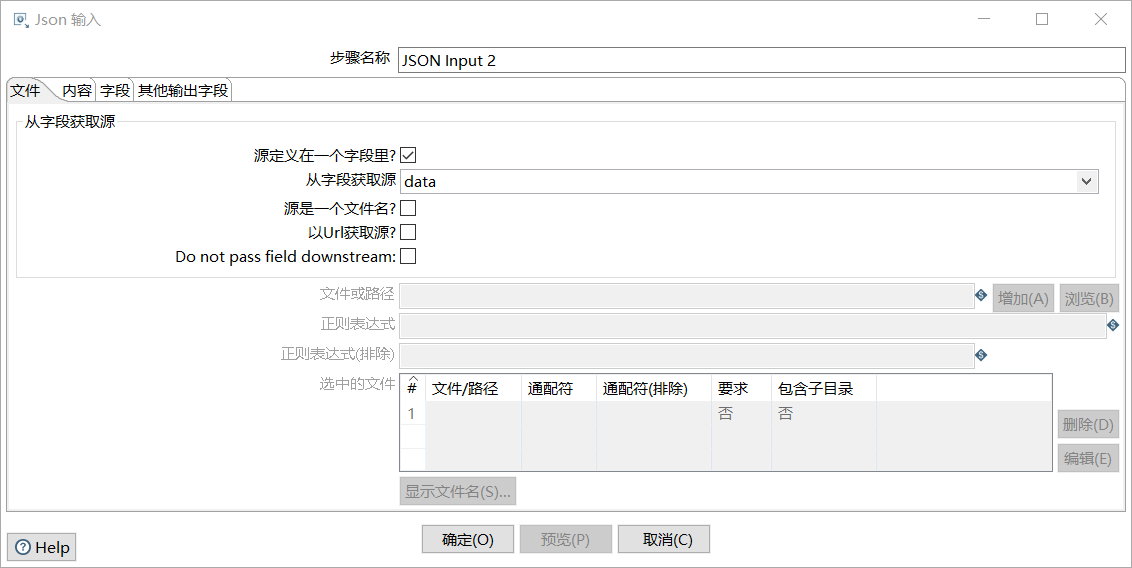 (2)配置“JSON input”控件,双击此控件进入“JSON input”界面,首先单击“浏览”按钮,选择要抽取的文件json_extract.json;接着单击“增加”按钮,将所选择的文件添加到“选中的文件”处,然后单击“字段”选项卡,在“字段”选项卡中添加要抽取的数据字段,具体配置如图2.2和图2.3所示;最后单击“确定”按钮,完成“JSON input”控件的配置。