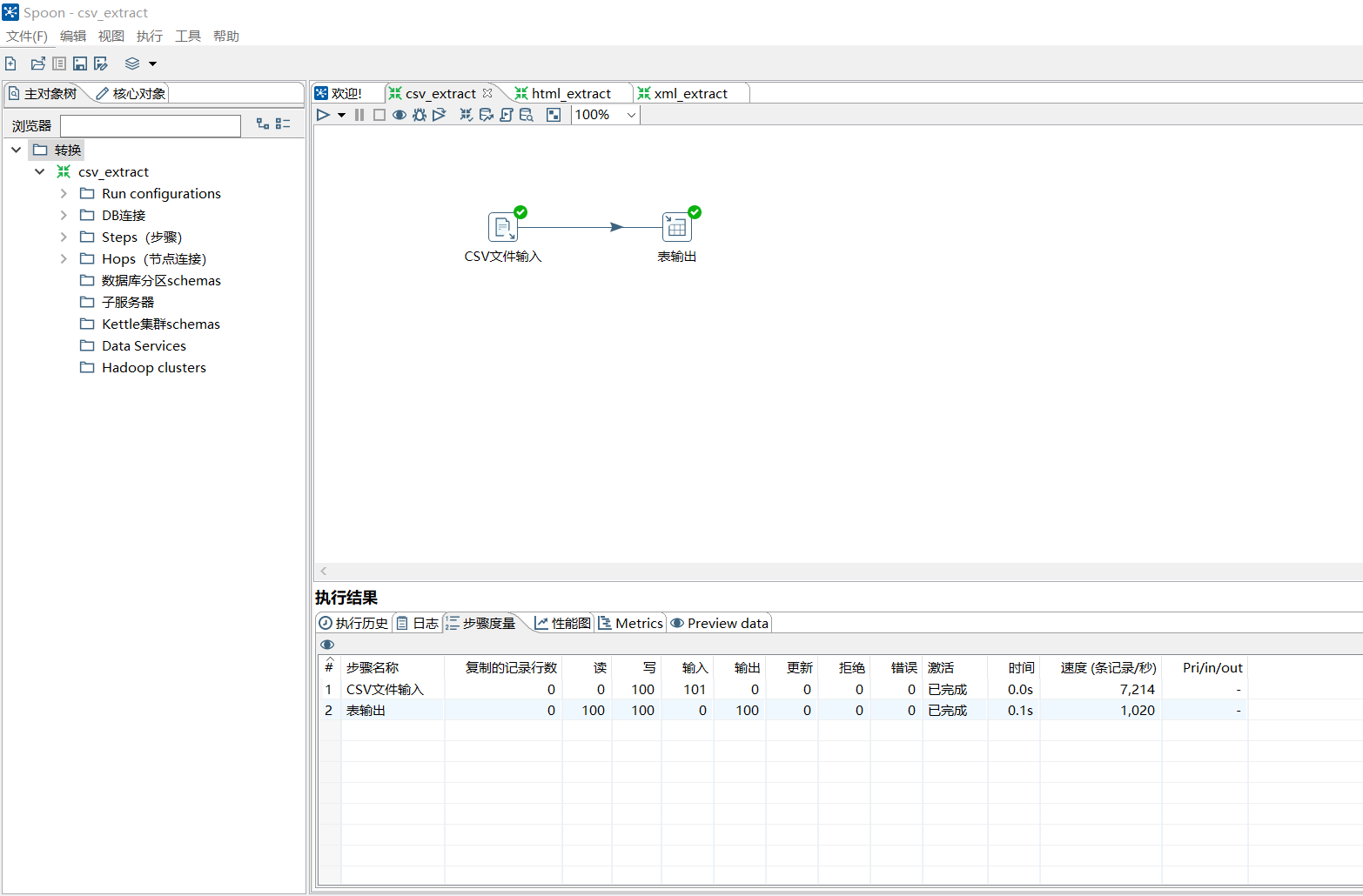 (4)运行转换csv_extract,实现将CSV文件中的数据抽取到数据表csv中,如图1.5所示。