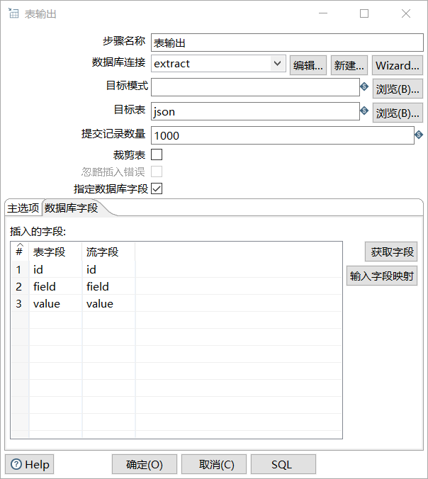 (4)配置“表输出”控件,双击此控件进入“表输出”界面,首先单击“新建”按钮,配置数据库连接(数据库连接不再详细操作);接着单击数据表右侧的“浏览”按钮,选择输出的目标表,即数据表json;勾选“指定数据库字段”复选框,用于数据表与文件中的字段匹配;然后选择“数据库字段”选项卡,单击“输入字段映射”按钮,弹出“映射匹配”对话框,依次选中“源字段”中的字段和“目标字段”中的对应字段,单击Add按钮将一对映射字段添加至“映射”框中;最后单击“确定”按钮,“表输出”控件配置完成。如图2.6所示。
