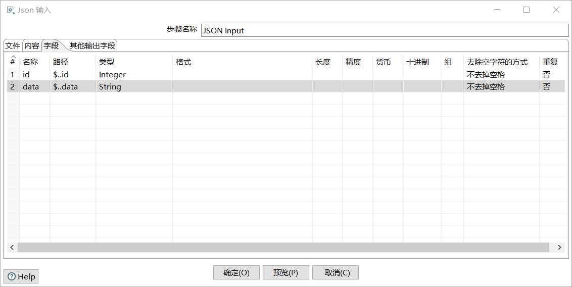 (3)配置“JSON input 2”控件,双击此控件进入“JSON input 2”界面,首先勾选“源定义在一个字段里?”复选框;接着在“从字段获取源”后的下拉列表中选择字段名,即data;然后单击“字段”选项卡,添加从字段data中抽取的field和value字段,具体配置如图2.4和图2.5所示;最后单击“确定”按钮,完成“JSON input 2”控件的配置。