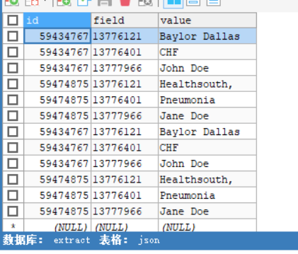 从图2.7中可以看到数据表json成功插入6行数据,说明我们成功的实现了将JSON文件 json_extract.json中key值为id、field和value的数据 抽取到数据表json中。
