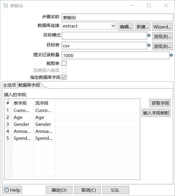 (3)配置“表输出”控件,双击此控件进入“表输出”界面,首先单击“新建”按钮,配置数据库连接(数据库连接不再详细操作);接着单击数据表右侧的“浏览”按钮,选择输出的目标表,即数据表csv;勾选“指定数据库字段”复选框,用于数据表与文件中的字段匹配;然后选择“数据库字段”选项卡,单击“输入字段映射”按钮,弹出“映射匹配”对话框,依次选中“源字段”中的字段和“目标字段”中的对应字段,单击Add按钮将一对映射字段添加至“映射”框中;最后单击“确定”按钮,“表输出”控件配置完成。如图1.4所示。