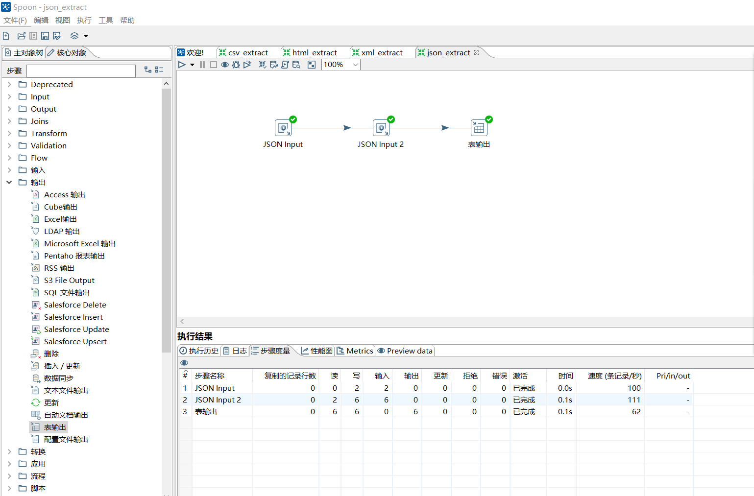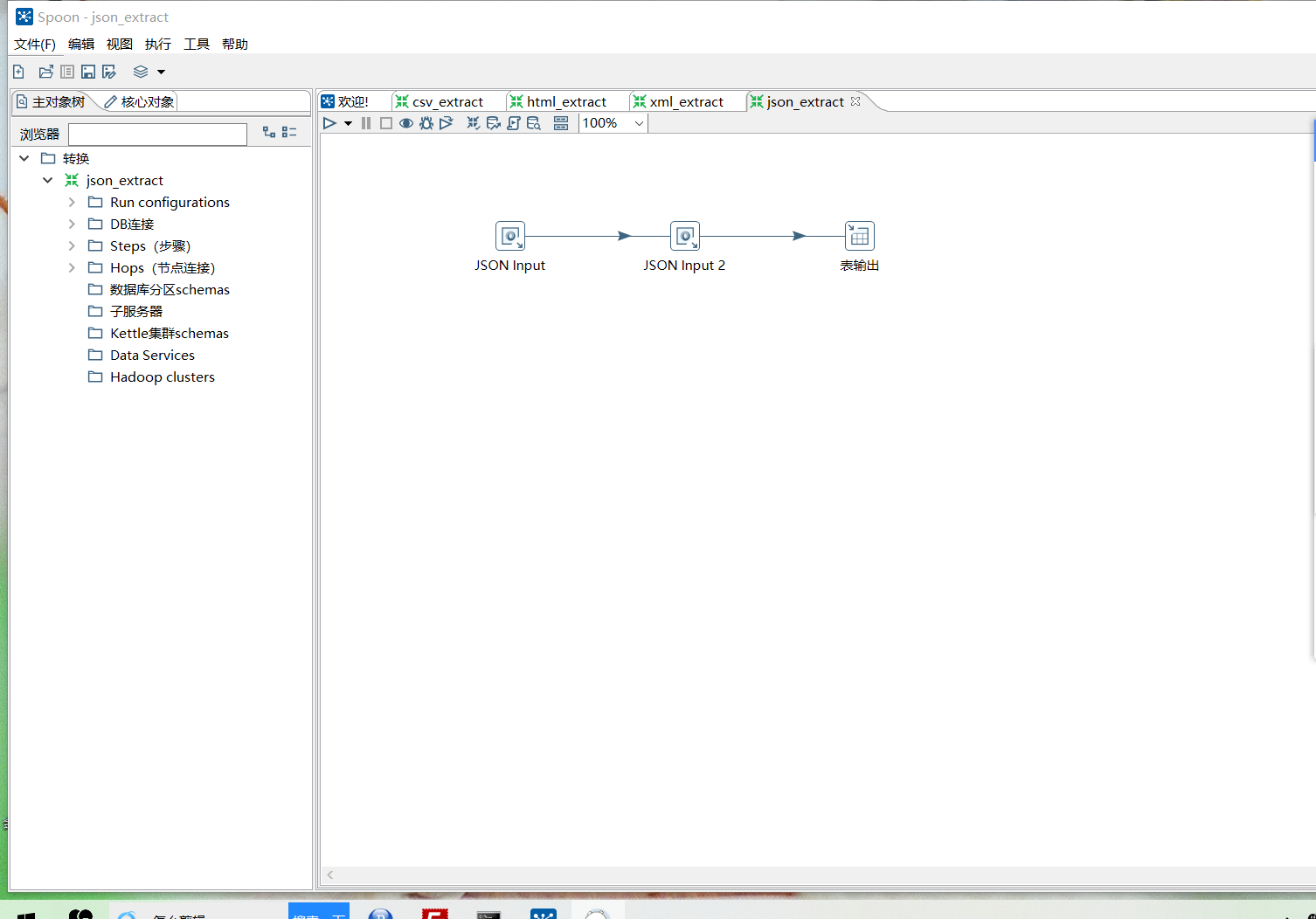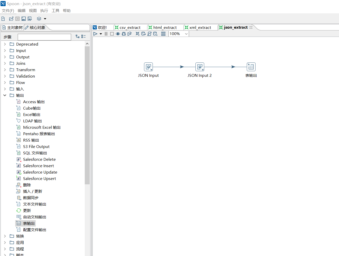 上述的两个数据抽取的实例中都使用了控件来实现抽取文件中的数据保存到数据库的数据表中,其中,第一个实例中用到了“CSV文件输入”控件和“表输出”控件,第二个实例用到了“JSON input”控件和“表输出”控件。具体如下图所示。