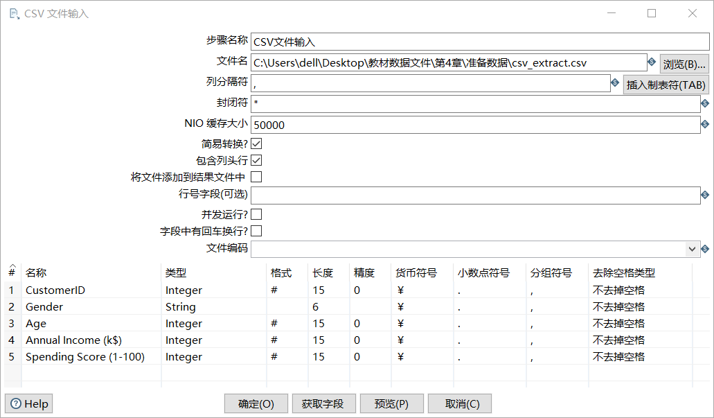 (2)配置“CSV文件输入”控件,双击此控件进入“CSV文件输入”界面,首先单击“浏览”按钮,选择要抽取的文件csv_extract.csv;接着单击“获取字段”按钮,Kettle自动检索CSV文件,并对文件中的字段类型、格式、长度等属性进行分析;然后单击“预览”按钮,查看文件中的数据是否抽取到CSV文件输入流中,单击“关闭”-“确定”按钮,完成“CSV文件输入”控件的配置。如图1.2和1.3所示。
