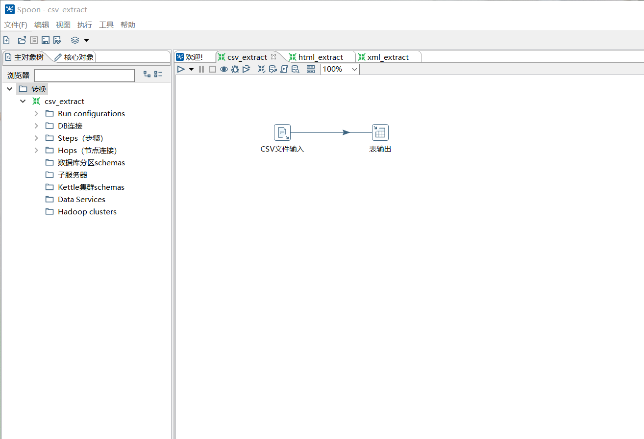 (1)打开kettle工具创建一个转换csv_extract,并添加“CSV文件输入”控件,“表输出”控件以及Hop跳连接线,用于实现CSV文件的抽取功能。如图1.1所示。