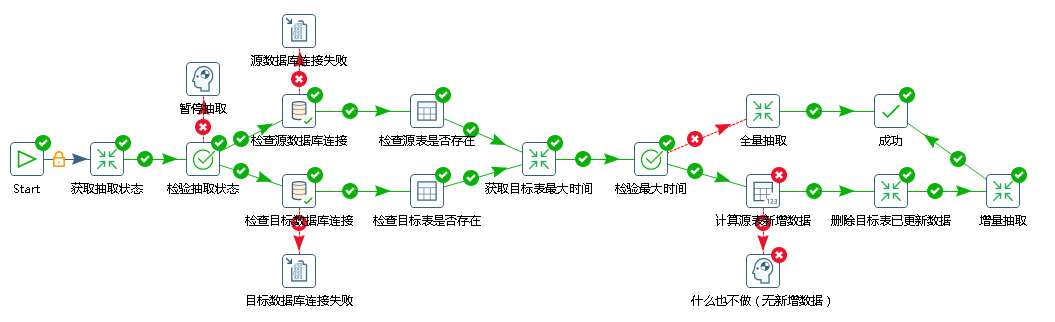 说到数据汇聚,我们通常采用的办法就是通过ETL工具进行抽取,也有通过Oracle触发器利用dblink方法同步的,也有采用ogg(商业使用收费)的,也有利用双机热备的,总之不管哪种方法适合自己的才是最好的!我这里用的是开源免费的ETL工具 —— kettle,下面简单将自己工作中对使用kettle增量抽取的理解和流程写出来,希望能帮助到入门的猿友,也欢迎各路大神和老师们的指教!废话不多说,先上作业图: