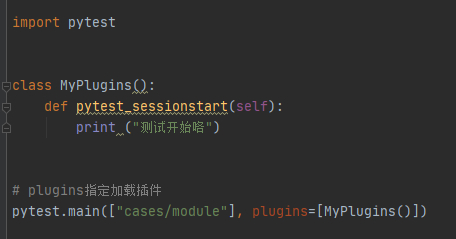 pytest.main(args,plugins) args:传一个list对象,list里面是多个命令行的参数 plugins 传一个list对象,在list里面初始化的时候注册的插件