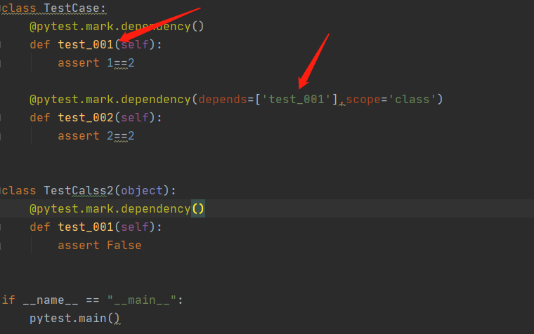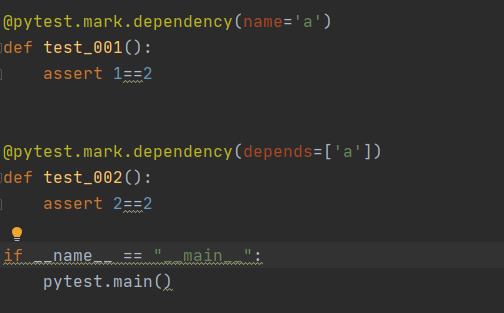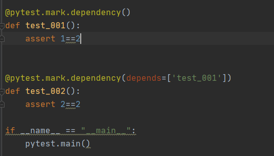 首先需要在用例开始位置打上装饰器@pytest.mark.dependency(),这里代表用例为主条件,如果该条用例失败,关联他的用例会跳过执行。
