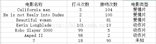 现在我们得到了样本集中所有电影与未知电影的距离,按照距离递增排序,可以找到k个距离最近的电影。假定k=3,则三个最靠近的电影依次是He’s Not Really into Dudes、Beautiful Woman和California Man。k-近邻算法按照距离最近的三部电影的类型,决定未知电影的类型,而这三部电影全是爱情片,因此我们判定未知电影是爱情片。