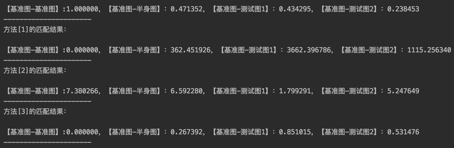 printf("方法[%d]的匹配结果:nn【基准图-基准图】:%f,【基准图-半身图】:%f,【基准图-测试图1】:%f,【基准图-测试图2】:%fn----------------------n",