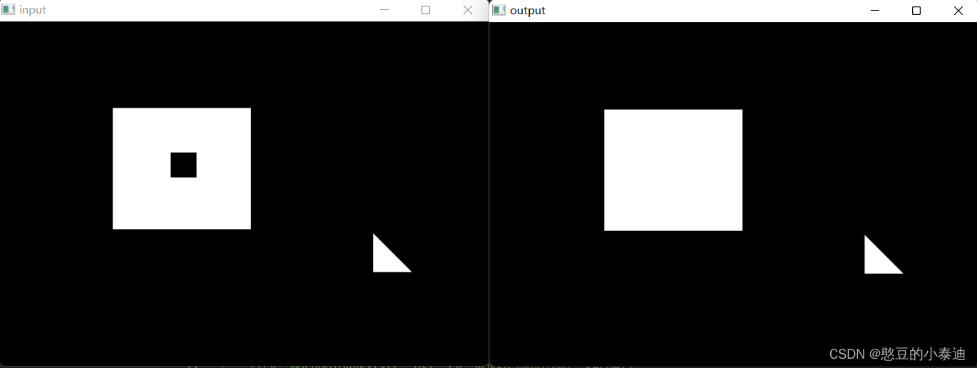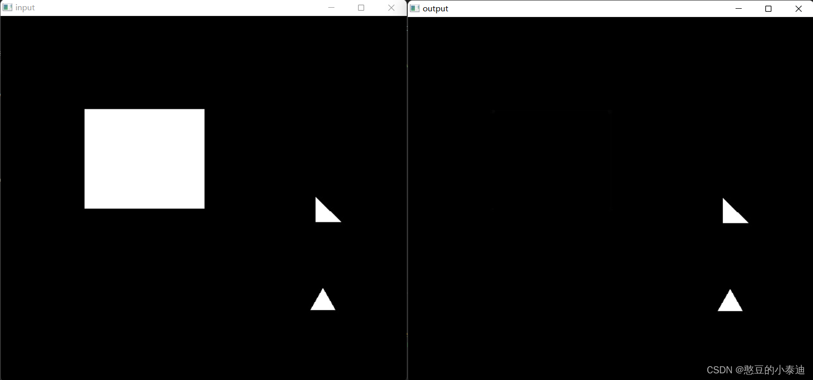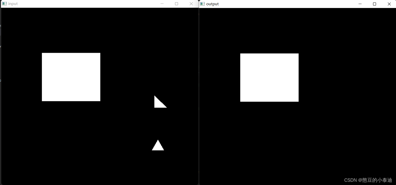 ② 作用:消除值低于邻近点的孤立点,达到去除图像中噪声的作用(假定对象是前景色、背景是黑色);连接两个邻近的连通域;弥合较窄的间断和细长的沟壑;去除连通域内的小型空洞;能够平滑物体的轮廓;