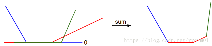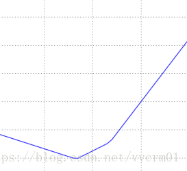 1维的数据损失图。X轴是单权重,Y轴是损失。数据损失是多个部分求和而成。其中每个部分要么与权重无关(等于0),要么是该权重的线性函数。完整的SVM数据损失就是这个形状的30730维版本。