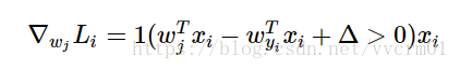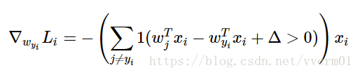其中1是一个指示函数,如果括号中的条件为真,那么函数值为1,如果为假,则函数值为0。虽然上述公式看起来复杂,但在代码实现的时候比较简单:只需要计算没有满足边界值的分类的数量(他们对损失函数产生了贡献),然后乘以就是梯度了。注意,这个梯度只是对应正确分类的W的行向量的梯度,那些j≠yi的梯度是: