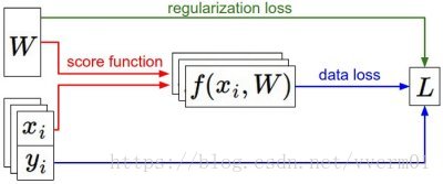 - 一个参数化的评分函数将原始图像像素映射到类得分(例如线性函数)