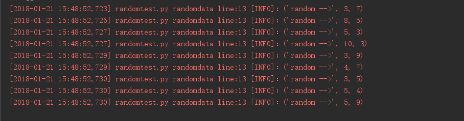 1 #coding:utf-8 2 import random 3 from pythontest.commlib.baselib import TestLog 4 5 log = TestLog().getlog() 6 def randomdata(): 7 8 i = 1 9 while i < 10: 10 randint_data = random.randint(1,10) #取10以内的随机整数 11 randrange_data = random.randrange(1, 10, 1) #取1-10以内的个位数,或者取11-100以内的两位数 12 num = "random -->" , randint_data , randrange_data 13 log.info(num) 14 i = i + 1 15 # log.info( ".//*[@id='%s']/h3/a" %(j) ) #参数输入格式化 16 17 randomdata()