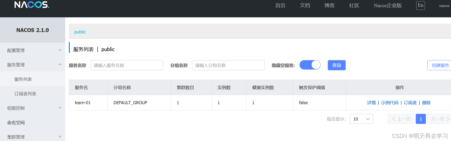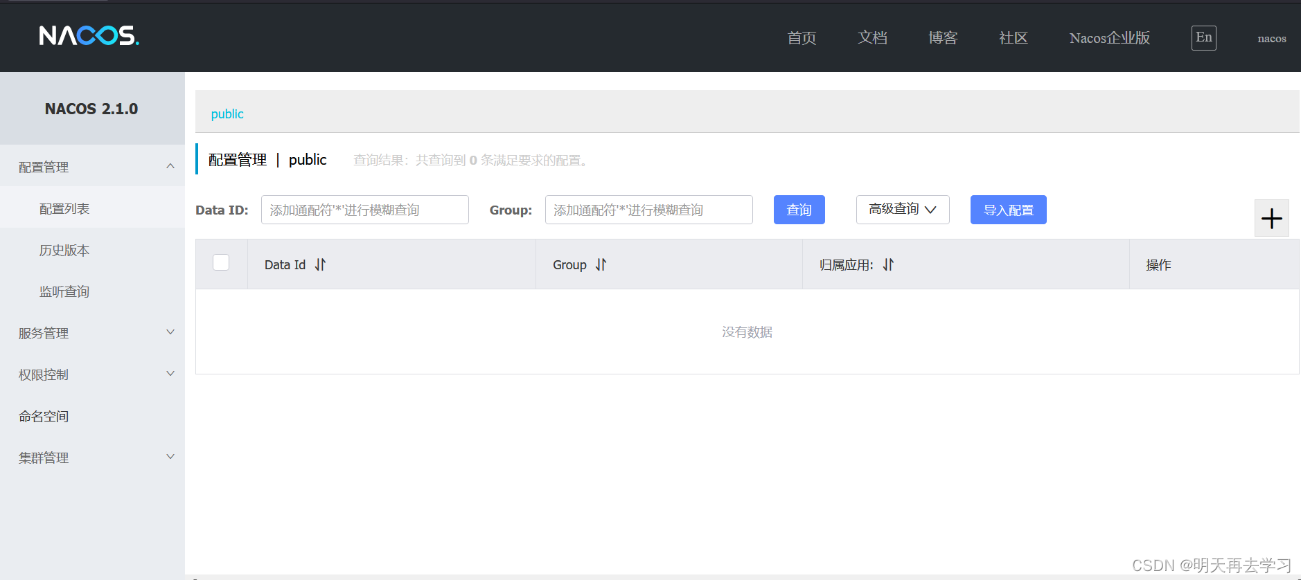 6、登陆nacos,nacos默认的用户名与密码都是nacos,登陆之后界面如下: