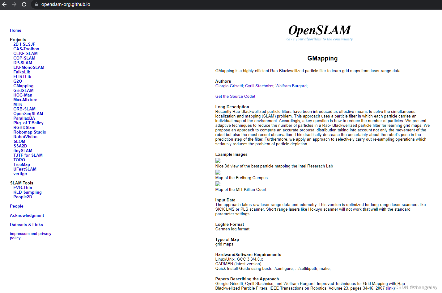 最近,引入了 Rao-Blackwellized 粒子滤波器作为解决同时定位和建图(SLAM) 问题的有效手段。 这种方法使用粒子过滤器,其中每个粒子都带有一个单独的环境图。 因此,一个关键问题是如何减少粒子的数量。 Gmapping提出了自适应技术来减少 Rao-Blackwellized 粒子滤波器中的粒子数量,以学习网格图。 Gmapping提出了一种计算准确提议分布的方法,该方法不仅考虑了机器人的运动,还考虑了最近的观察结果。 这大大降低了过滤器预测步骤中机器人姿势的不确定性。 此外,Gmapping采用一种方法来选择性地执行重新采样操作,从而严重减少了粒子耗尽的问题。
