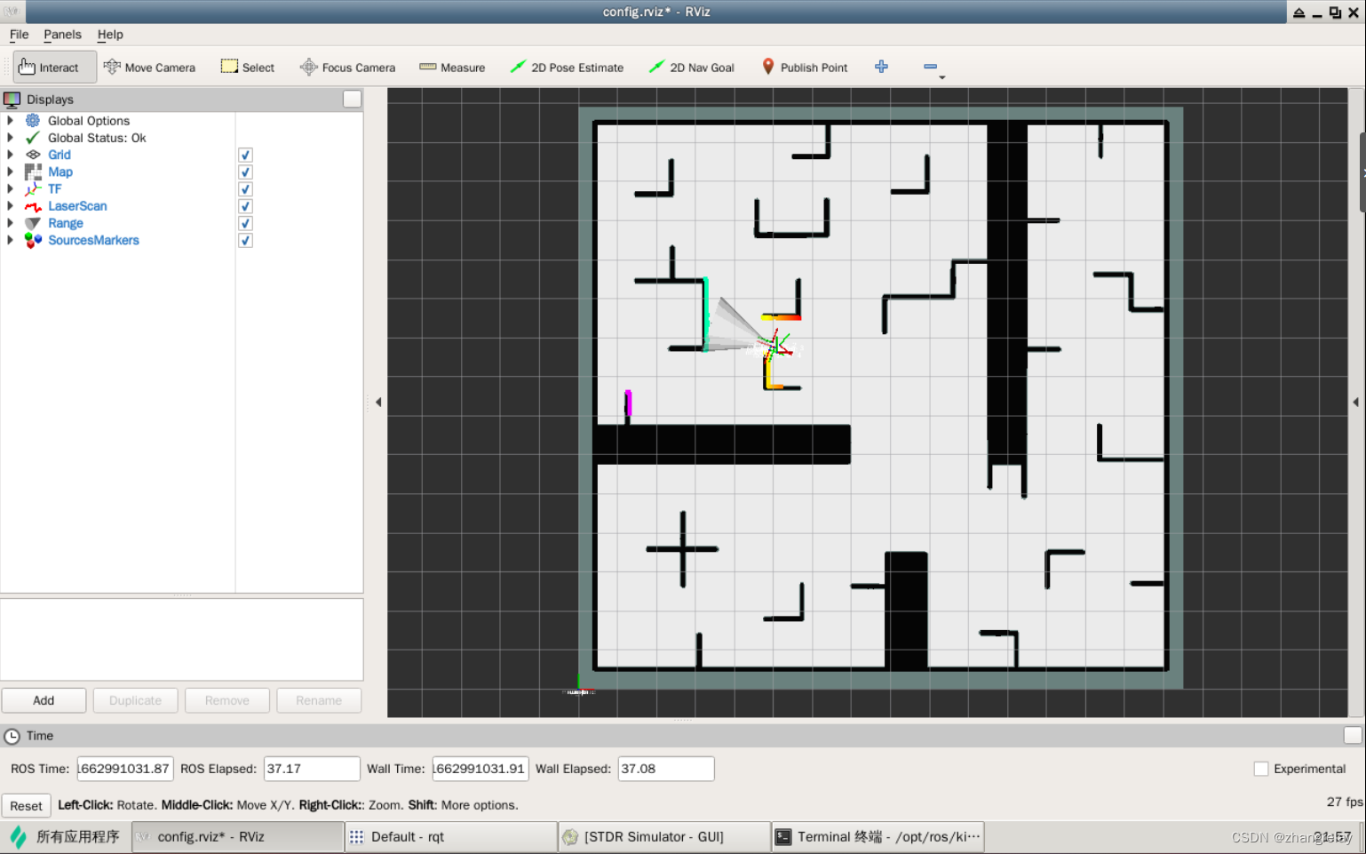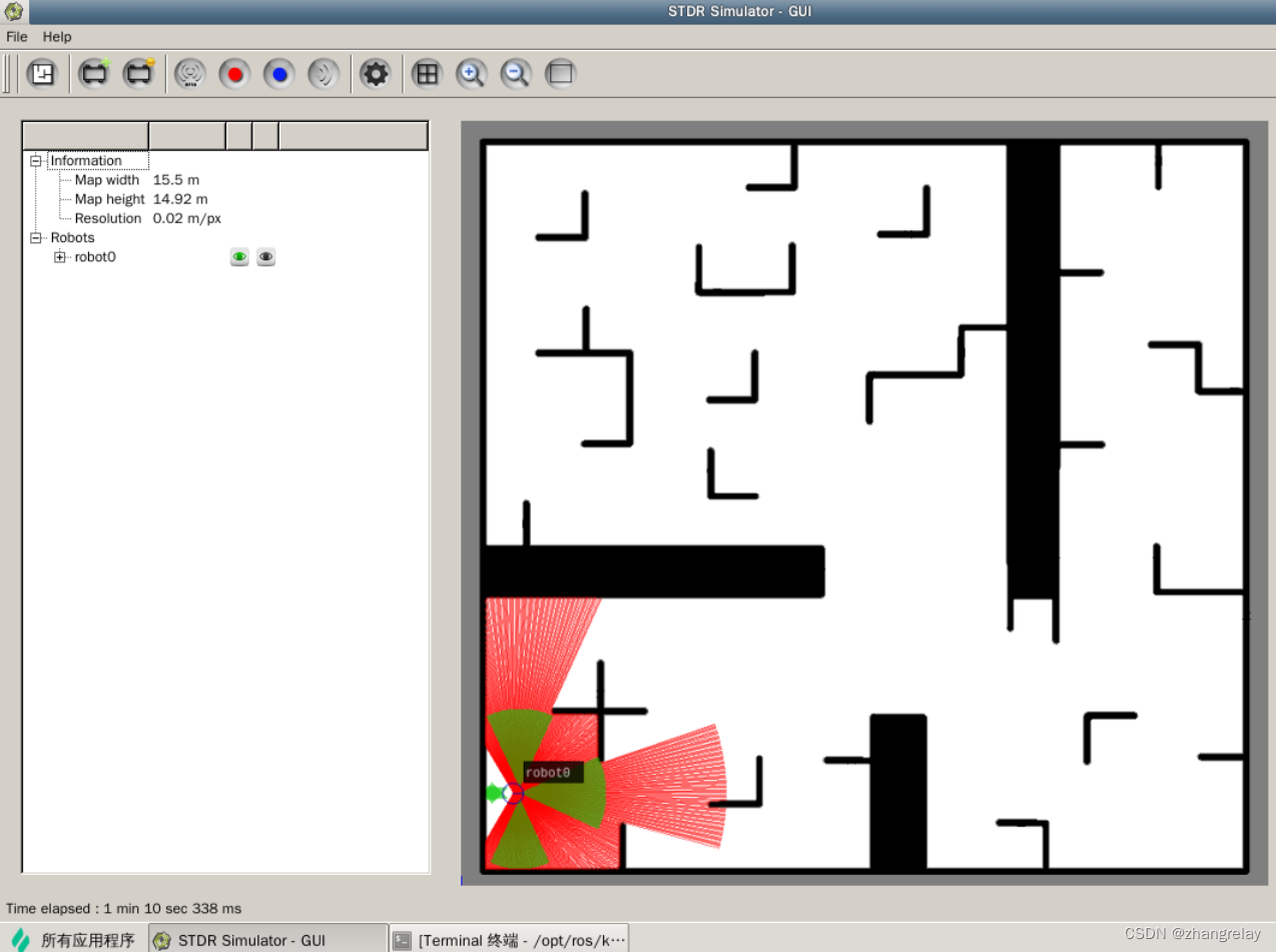 可以运行rviz并订阅/gmapping/map主题以可视化地图,或者可以使用stdr_launchers包提供的启动器并更改订阅的主题。在新终端中,运行: